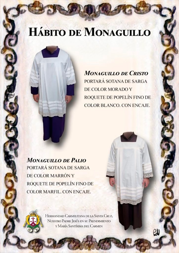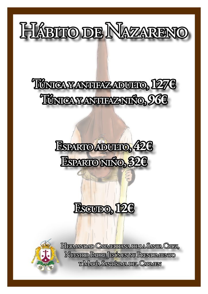 - La túnica será de sarga o lienzo marfil de cola, con tres botones de dos centímetros de diámetro forrados de tela marrón en la zona superior delantera y distribuidos hasta una altura aproximada de unos treinta centímetros, siempre. El antifaz, que será asimismo igual tejido, en color marrón, se elevará sobre la cabeza con cartonera cónica o capirote de ochenta a cien centímetros de altura, y caerá sobre la espalda, hombro y pecho, en donde irá sobrepuesta el escudo de la Corporación. La túnica irá ceñida a la cintura por un cinturón de esparto natural de entre veinticinco y treinta centímetros de ancho, pasando la cola de la túnica por detrás del mismo y saliendo por encima. Todos los nazarenos calzarán zapatos y calcetines de color negro, y no deberán llevarse guantes, anillos, pulseras o alhajas que desdigan del sentido penitencial de la procesión y solamente se permite la alianza matrimonial. Tampoco podrán tenerse uñas pintadas.