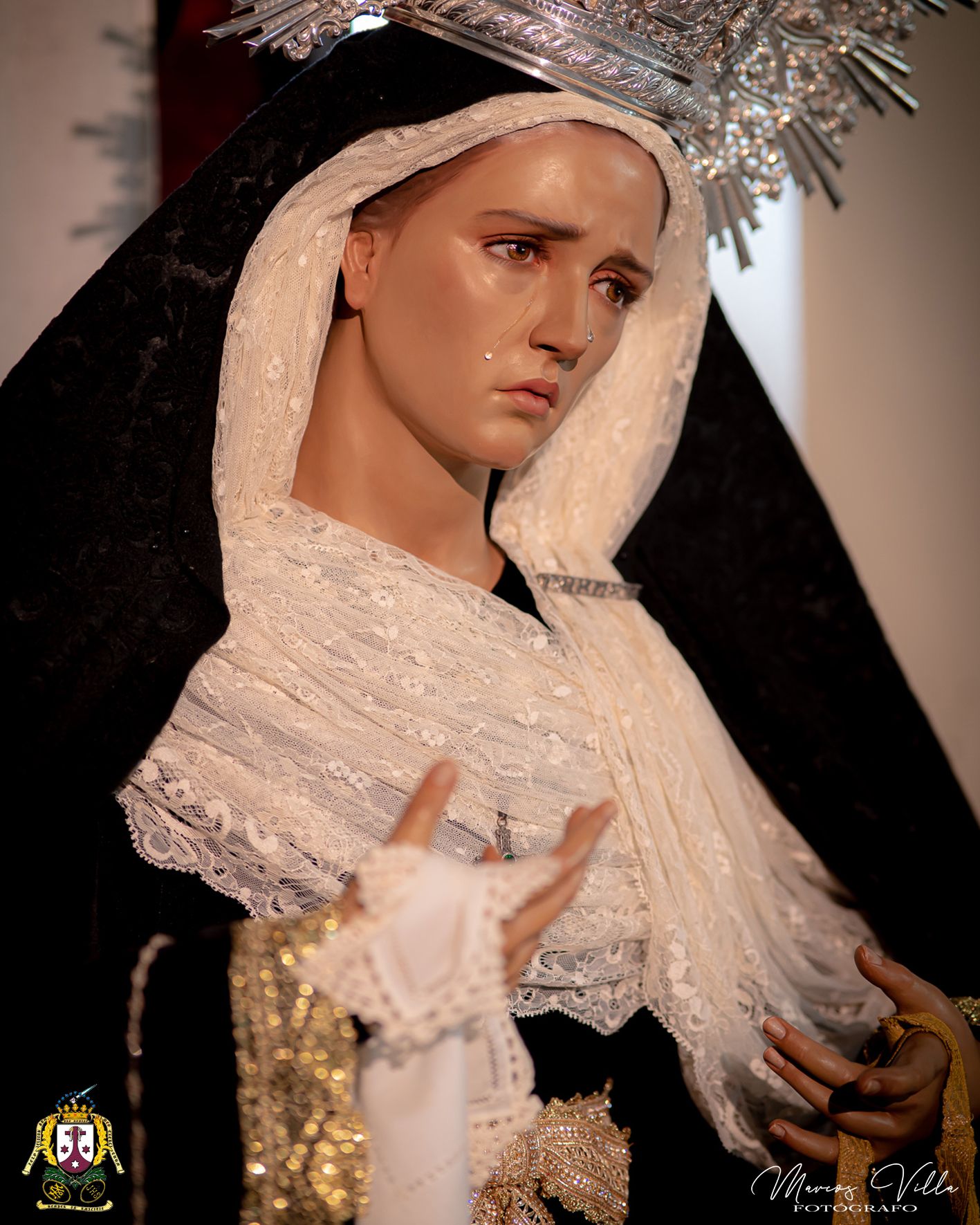 Sobre sus sienes porta la corona de plata. Con su mano derecha sostiene un pañuelo de tul bordado en tonos beige y un rosario de plata, mientras que en su mano izquierda, porta su habitual escapulario realizado en orfebrería color plata propio de su iconografía. Sobre su pecho y como único adorno se dispone una cruz de plata enriquecida con pedrerías.