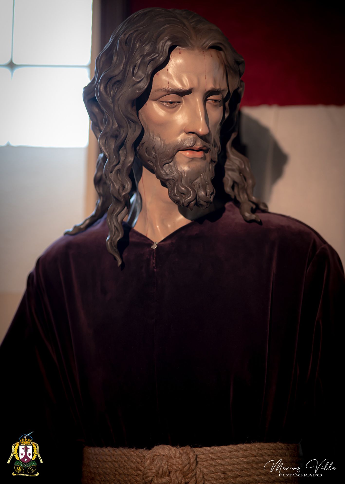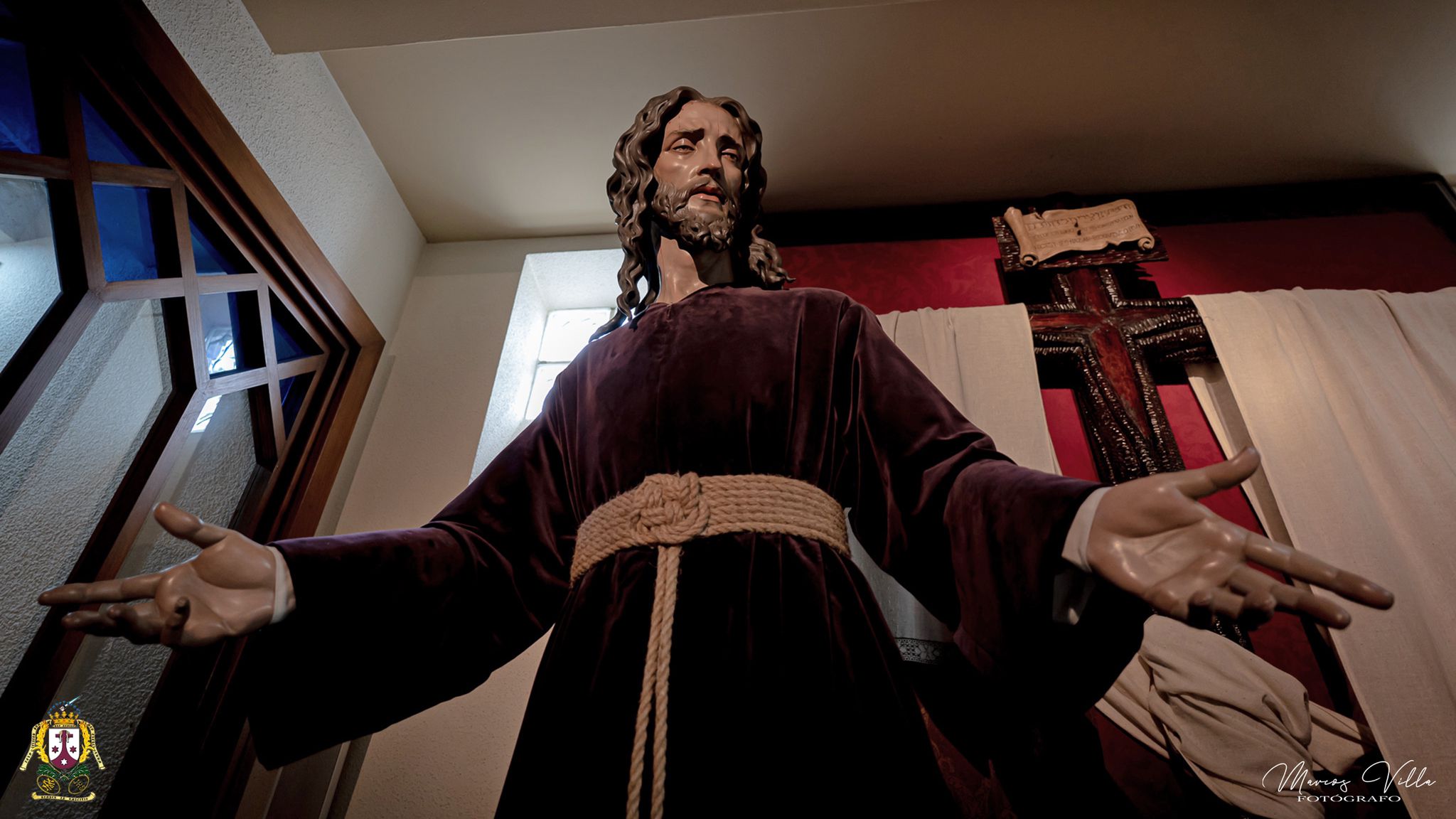 Nuestro Padre Jesús en su Prendimiento viste túnica morada que estrenase para sus primeros cultos y cíngulo en yute.