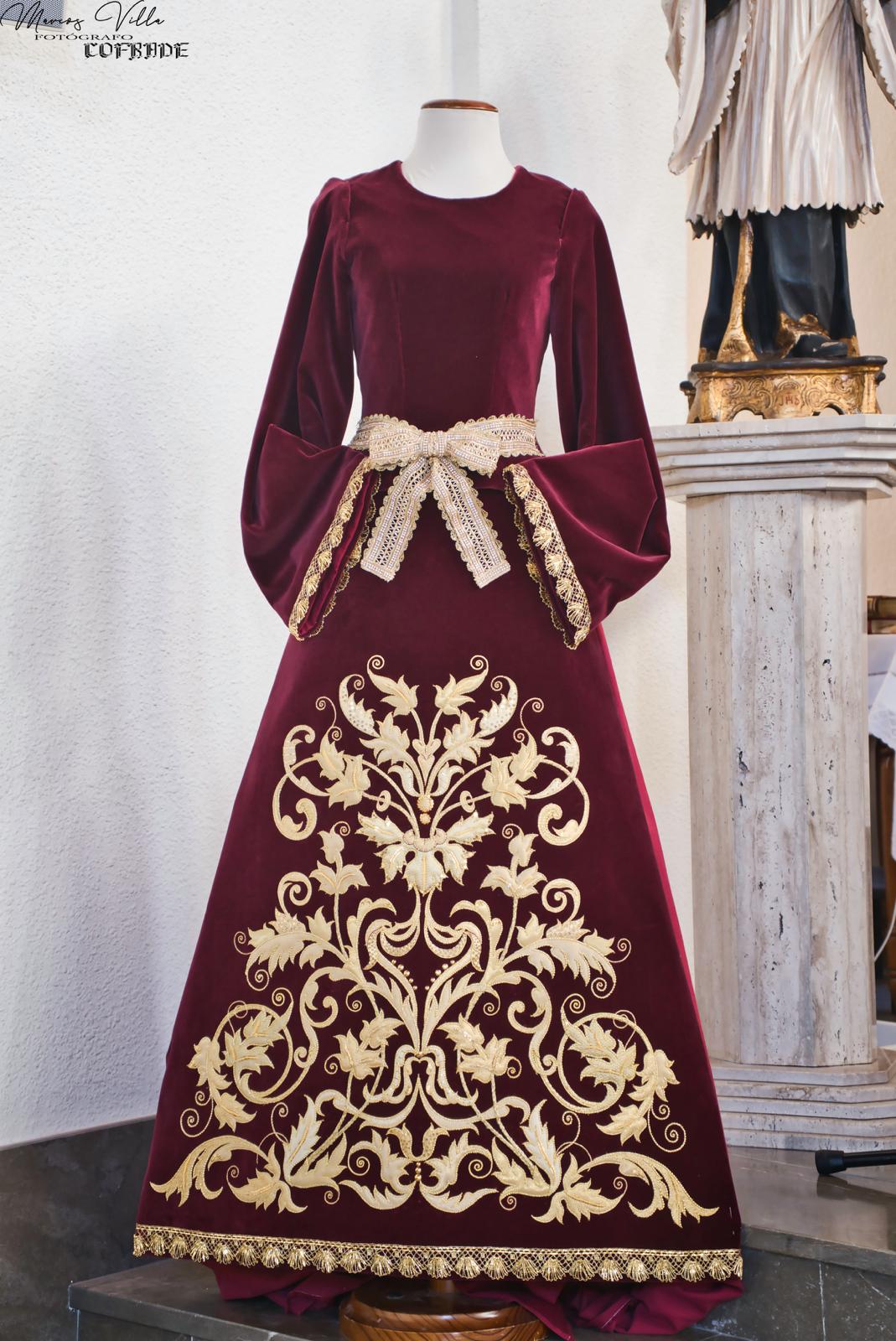 Esta saya fue elaborada por el taller durante el curso pasado. La obra es realizada en la técnica de recorte enriquecido y sobre terciopelo de algodón en tono burdeos con diseño de Enrique Carrascal, responsable de dicho curso.